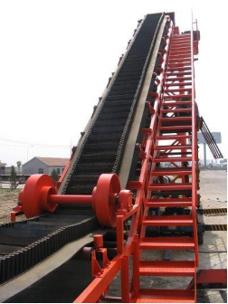 大傾角皮帶輸送機結構的重要特征是用回轉皮帶(稱為肋骨)代替普通的輸送帶。 它的工作原理和結構組成與通用皮帶輸送機相同。 因此,驅動鼓,換向鼓,惰輪,張緊裝置,驅動裝置,中間框架,中間腿,尾架,排放漏斗,頭罩,空氣濾清器,保護裝置等。 它可以與通用皮帶輸送機的相應部件一起使用。